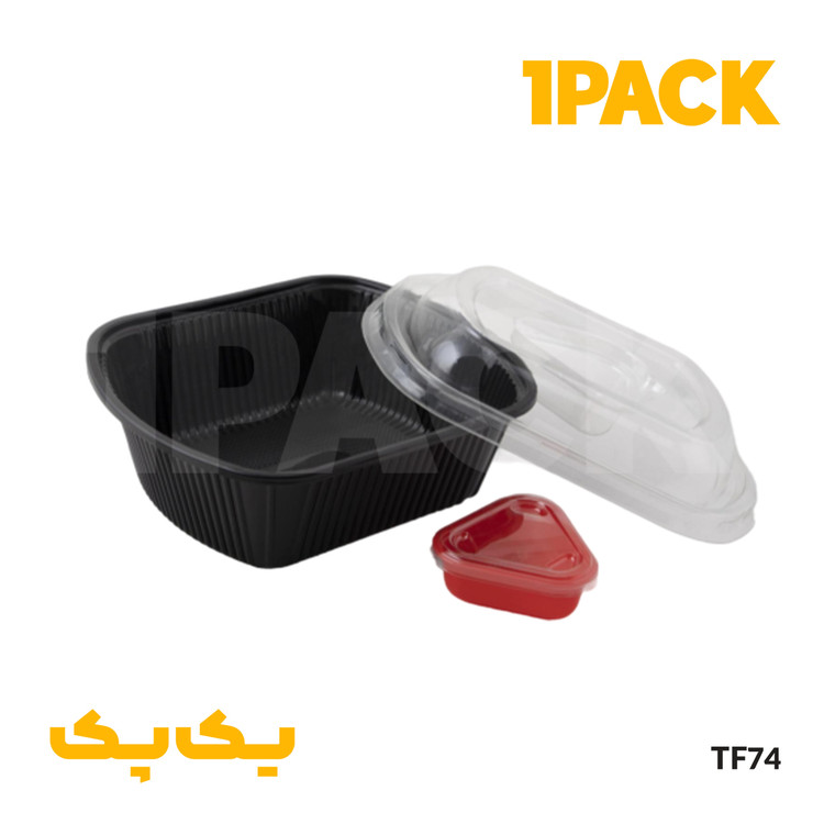 جنس بدنه ظرف tf 74 شرکت سپهر پلاست ،پلی پروپیلن ماکروویوی به رنگ مشکی و درب ان شفاف و رنگ سس کاپ مشکی و قرمز می باشد.