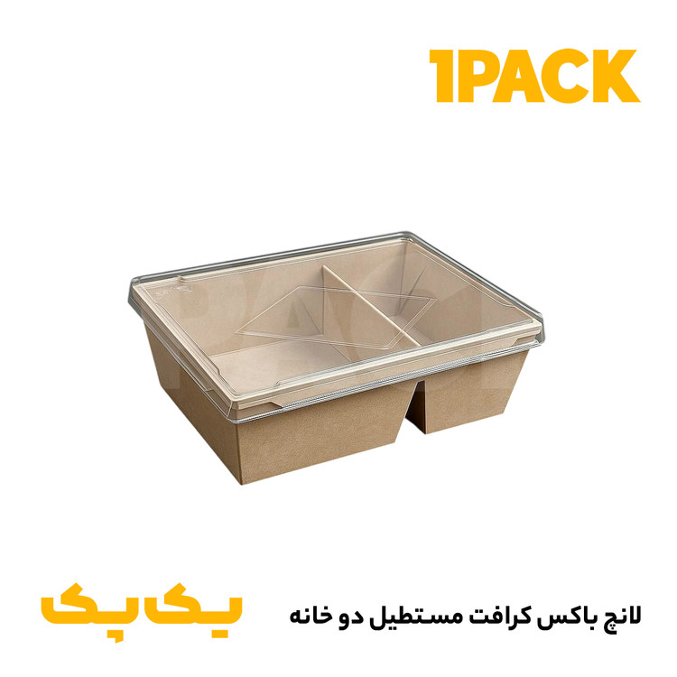 پک کرافت چهارگوش مقوایی دیوایدر دار یک پک دارای درب شفاف و محکم می باشد که موجب جلوگیری از سرد شدن و ظاهر بهتر و دیده شدن غذاهای ارسالی و دلیوری میگردد.