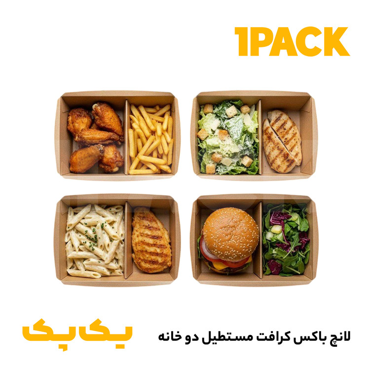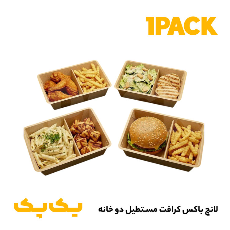 ظرف کرافت مقوایی یکبار مصرف مستطیل دوخانه ، محصولی جدید از یک پک که از مقوای درجه یک کرافت وارداتی تولید شده و دارای یک لایه داخلی محافظ جهت جلوگیری از نشتی می باشد.