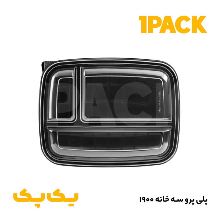 ظرف 3 خانه پلی پرو طب پلاست کبابی جدید با بدنه مشکی و درب شفاف از مواد اولیه با کیفیت pp فود گرید تولید شده که امکان سرو انواع غذای سرد و گرم داخل سالن و بیرون بر را فراهم میکند.
